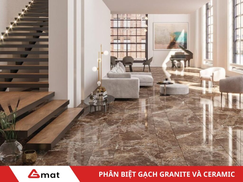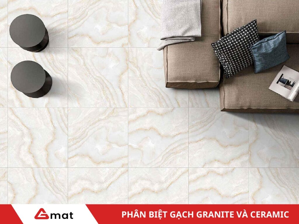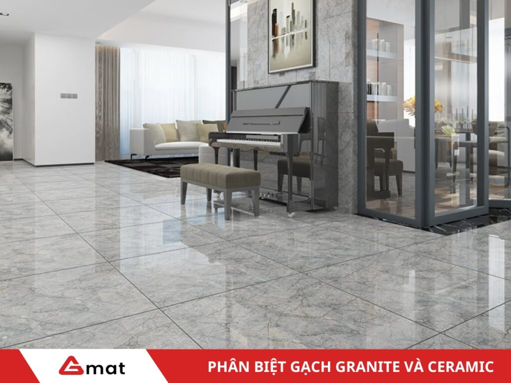 Gạch Ceramic có cấu trúc gồm lớp xương gạch và lớp men phủ riêng biệt, trong khi gạch Granite đồng chất từ trong ra ngoài. Vì vậy, gạch Granite cứng chắc, chống trầy xước và mài mòn tốt hơn Ceramic, thích hợp cho không gian có mật độ đi lại cao.